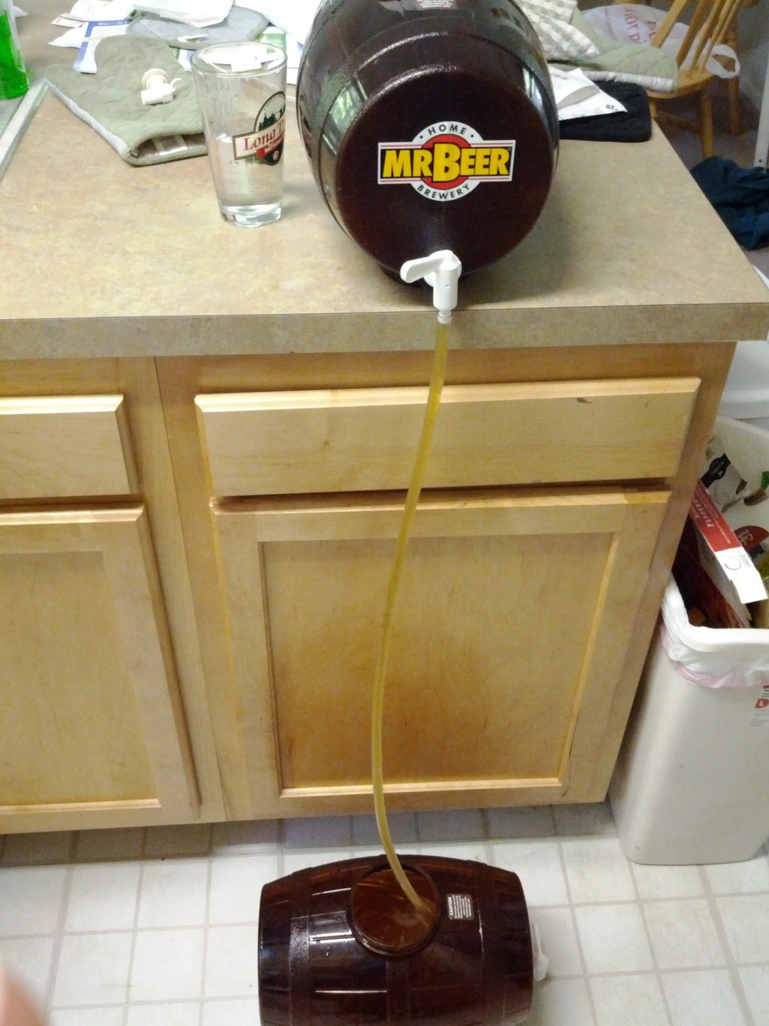 It was a rather simple method of racking, using just vinyl tubing (7/16″, I believe) and gravity. It also involved a second Mr. Beer fermenter, and everything was sanitized of course. I put the empty fermenter below the full one, and hooked the tubing up to the nozzle of the full fermenter. To reduce splashing, I wrapped the